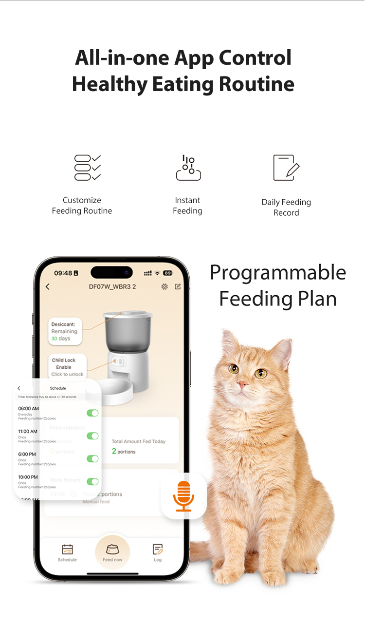 Experience the convenience and intelligence of our 4L Pet smart feeder, designed to make your life easier and your pet's mealtime more enjoyable. This advanced device allows you to effortlessly schedule and control your pet's feedings, ensuring they receive the right amount of food at the right time. With a spacious 4L capacity, it can accommodate the needs of small, medium, and large-sized pets, providing a continuous supply of nutrition. Whether you're a busy professional, a multi-pet household, or a pet owner seeking efficiency and peace of mind, our smart feeder is the perfect solution.